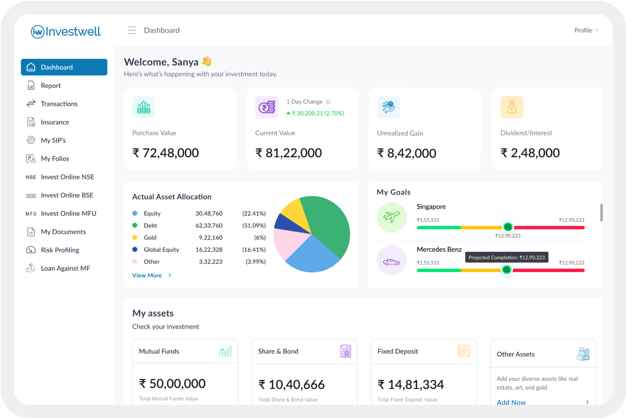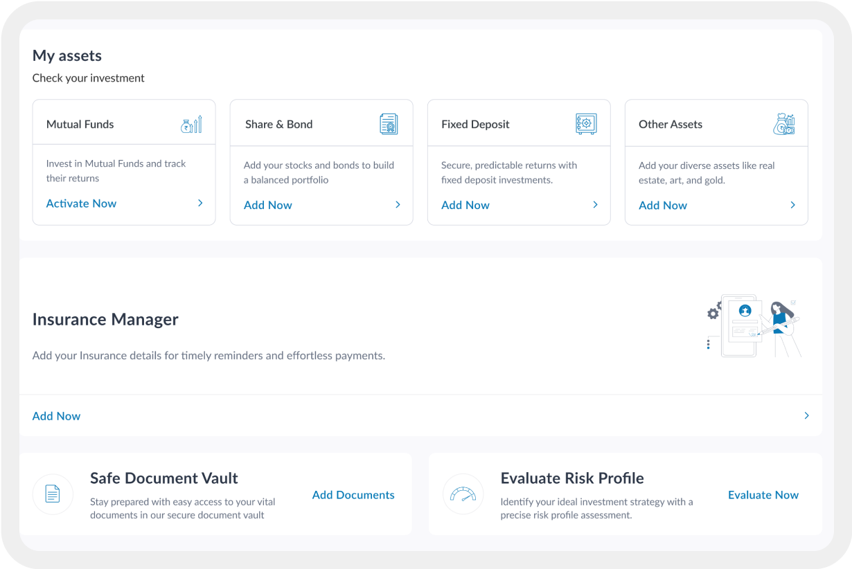 Asset Addition: Enabled users to add diverse asset classes, including mutual funds, bonds, stocks, fixed deposits, real estate, gold, and insurance policies.